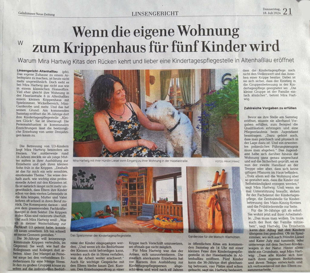 Ich bin Mira Hartwig und wohne seit zwei Jahren mit meinem 17-jährigen Sohn, meiner Hündin und meinem Kater in einem charmanten alten Haus in Altenhaßlau. Schon immer habe ich davon geträumt, eine Kindertagespflegestätte zu eröffnen, und nun wird dieser Traum Wirklichkeit. Mit viel Liebe und Hingabe möchte ich Kindern im Alter von 1 bis 3 Jahren einen geborgenen Ort bieten, an dem sie spielen, lernen und wachsen können.